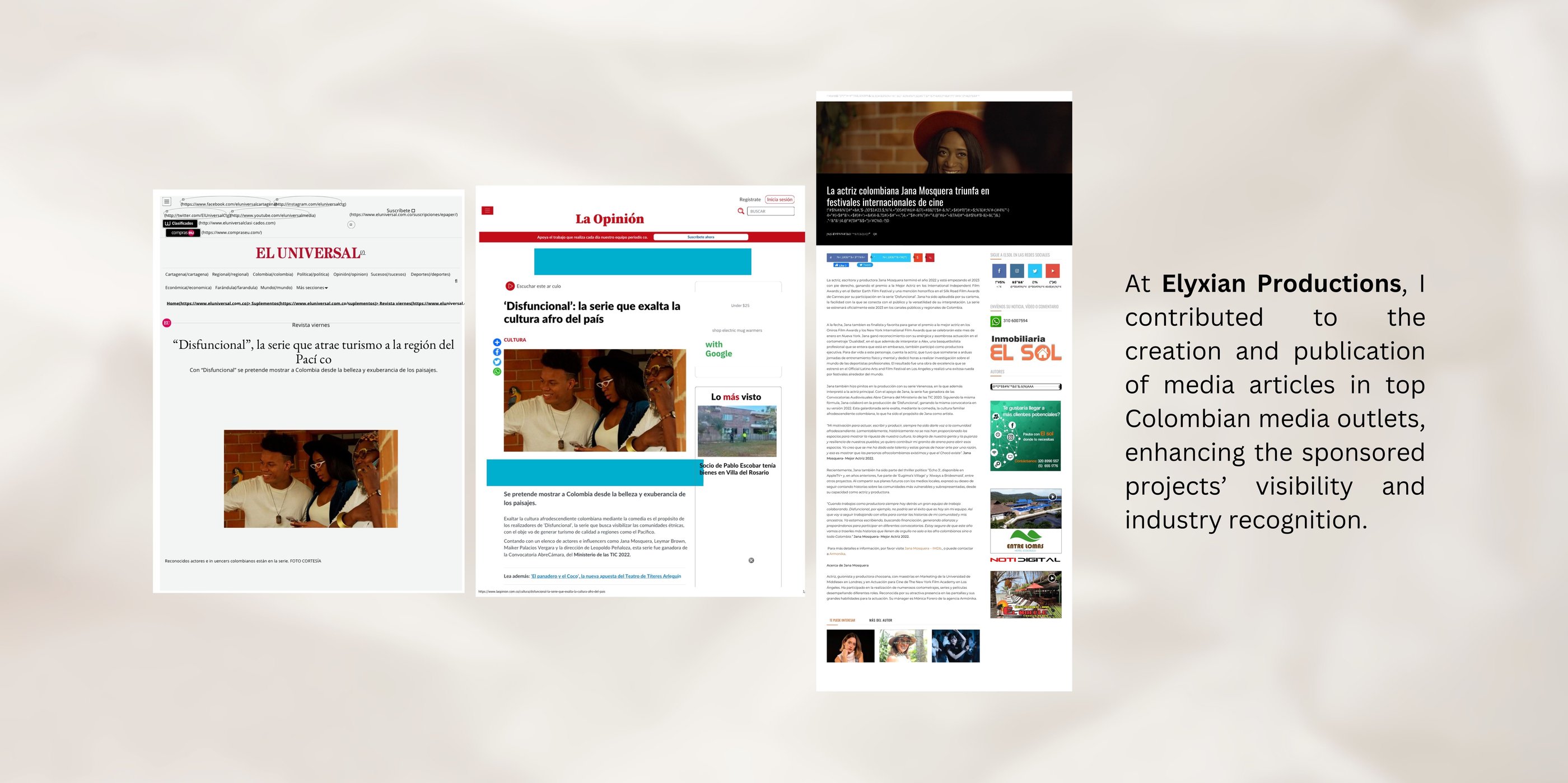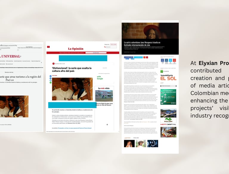 At Elyxian Productions, I contributed to the creation and publication of media articles in top Colombian media outlets, enhancing the sponsored projects’ visibility and industry recognition.